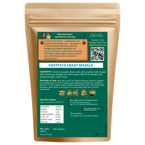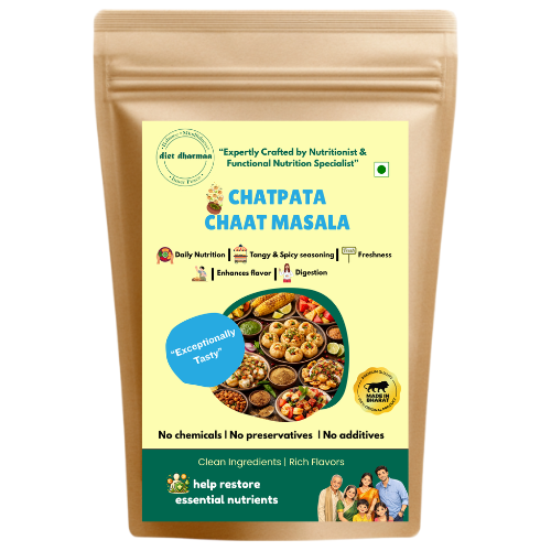 Diet Dharmaa Chatpata Chaat Masala is a tangy, spicy seasoning blend made with traditional Indian spices that instantly enhances the flavor of fruits, chaats, snacks, and salads. Crafted with natural ingredients, it supports digestion and adds a burst of zesty taste to everyday meals — with no chemicals, preservatives, or additives.