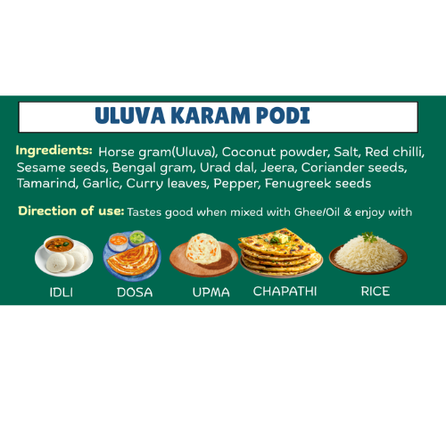 Uluva Karam Podi (Horse Gram) is a hearty and flavourful South Indian spice mix made using horse gram (uluva/ulavalu) and perfectly roasted traditional spices. It has a rich nutty taste, deep roasted aroma, and a spicy punch that makes everyday meals instantly satisfying.