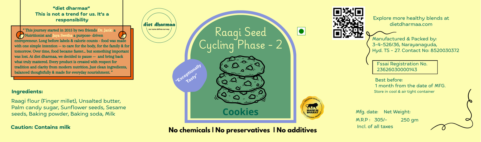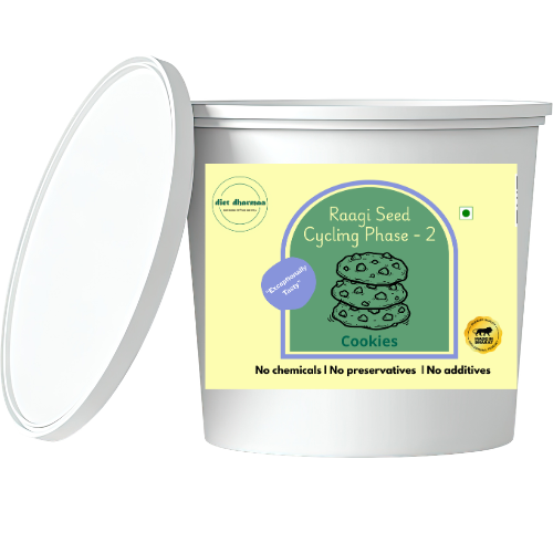 Nourish your body naturally during Phase-2 of seed cycling with Diet Dharmaaa’s Raagi Seed Cycling Phase-2 Cookies — a delicious blend of traditional millets and functional nutrition.